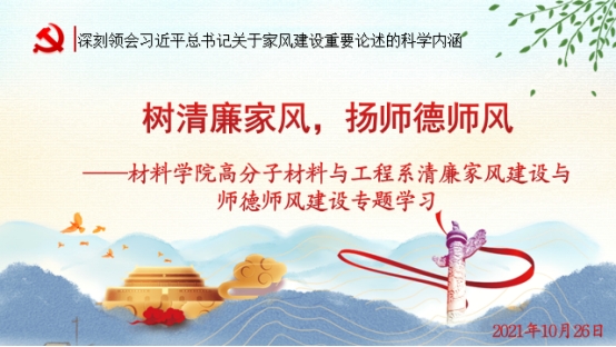 为深入贯彻落实习近平总书记关于注重家庭家教家风建设的重要指示精神,发挥高校教师清廉家风与师德师风的引领示范作用,10月26日下午,yL23411永利集团高分子材料与工程系在研发楼717会议室召开了“树清廉家风,扬师德师风”专题学习会议。会议由系主任杜杰教授主持,学院党委胡先文书记参加了会议并作动员讲话。