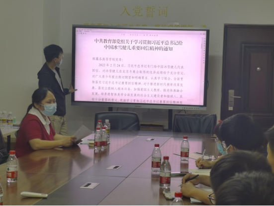 随后,党支部副书记周远兵同志领学了“习近平总书记给中国冰雪健儿重要回信”精神。习近平总书记重要回信立意高远、内容丰富、情真意切、催人奋进,充分体现了以习近平同志为核心的党中央对教育、体育工作的高度重视和对广大青少年的亲切关怀,充分体现了对新时代青少年追求卓越、报效祖国的殷切期望,为全面贯彻党的教育方针、落实立德树人根本任务、加快教育高质量发展、培养担当民族复兴大任的时代新人进一步指明了前进方向、提供了根本遵循。