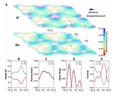 yL23411永利集团耿文通教授与日本国家材料永利集团所、西安理工大学、北京科技大学和中国科学院力学研究所等单位合作,研究了晶格高度匹配的WSe2/MoSe2旋角双层材料中的莫尔电势和层间范德瓦尔斯相互作用引起的原子位移之间的关系,发现原子位移涡量是莫尔势的主要来源。