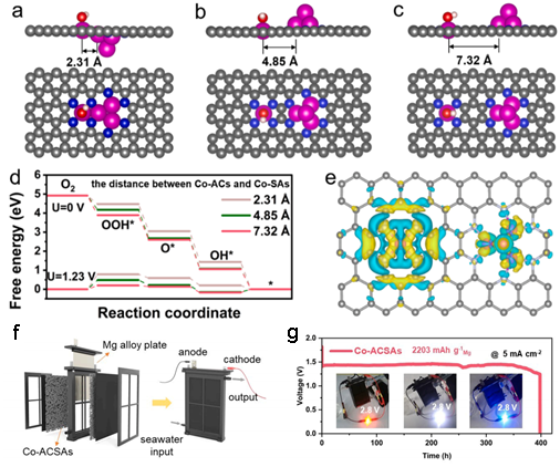 基于此,永利yl23411集团邓意达教授、郑学荣教授、王浩志副研究员等人设计了一种原子级电催化剂,即由卫星Co单原子(Co-SAs)包围的Co原子团簇(Co-ACs)构成的电催化剂(Co-ACSAs)。理论计算结果表明,Co-ACSAs中的Co原子团簇具有较强的Cl-吸附能力,但对O2的吸附能力较低。相反,Co单原子对Cl-的吸附能力较低,而对O2的吸附能力较强。在该理论计算的启发下,我们推测在海水环境中,Co-SAs附近的Co-ACs可能在保护Co-SAs免受Cl-中毒方面发挥关键作用,而Co-SAs位点上较强的O2吸附能力将有助于促进海水电解质中对溶解氧的捕获。基于这一理念,我们利用超快高温闪烧(HTS)策略,将Co-ACs和卫星Co-SAs稳定地锚定在N掺杂碳基底上。实验与计算证明,由于Co-ACs和Co-SAs之间的最佳距离,Co-ACs通过与Co-SAs通过相互连接的六原子环来调节附近的电子结构,从而促进氧活性物质在Co-SAs上的吸附。并通过降低ORR反应能垒,加速了OOH*的形成。在天然海水中,Co-ACs和Co-SAs之间的强相互作用导致了卓越的ORR活性和稳定性,明显优于纯相的Co-SAs和Co纳米颗粒(Co-NPs)催化剂。采用Co-ACSAs作为阴极电催化剂,组装的海水电池其峰值功率密度达到96 mW cm-2;在电流密度为5 mA cm-2时,保持稳定至少380小时;在天然海水中,放电电压可达到1.46 V。这项研究为深远海域用电器提供长期稳定能源提供了可行的ORR电催化剂,并在海水电催化方面取得了显著的性能改进。