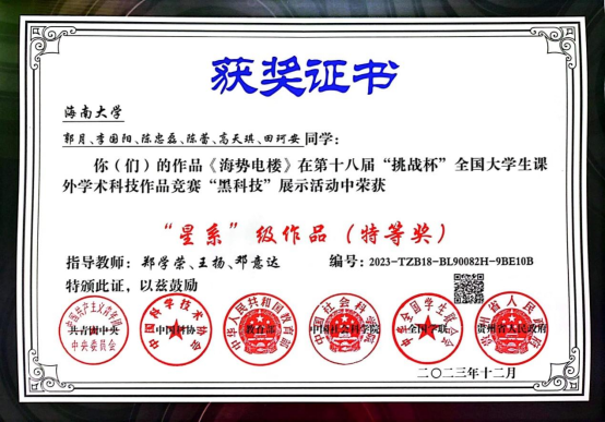 近日,第十八届“挑战杯”全国大学生课外学术科技作品竞赛“黑科技”专项赛结果公布,由永利yl23411集团材料学院郑学荣、王杨和邓意达教授指导的本科生创新团队作品获得“星系”级(特等奖)。