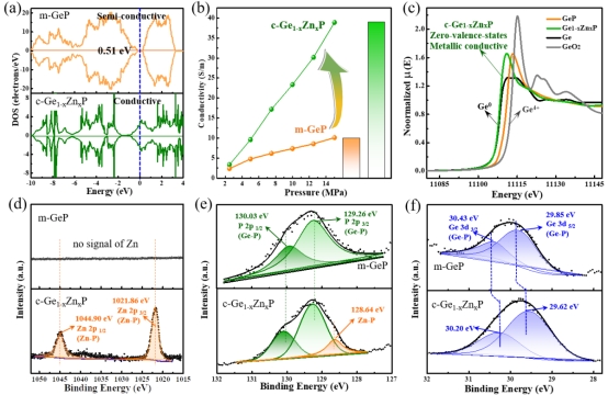 图2. 比较单斜相GeP与立方相Ge1−xZnxP的能带结构/态密度(a),粉末导电性测试(b),同步辐射Ge-K edge硬X射线吸收图谱(c),高分辨XPS光电子能谱Zn 2p(d),P 2p(e)及Ge 3d(f)图谱分析。