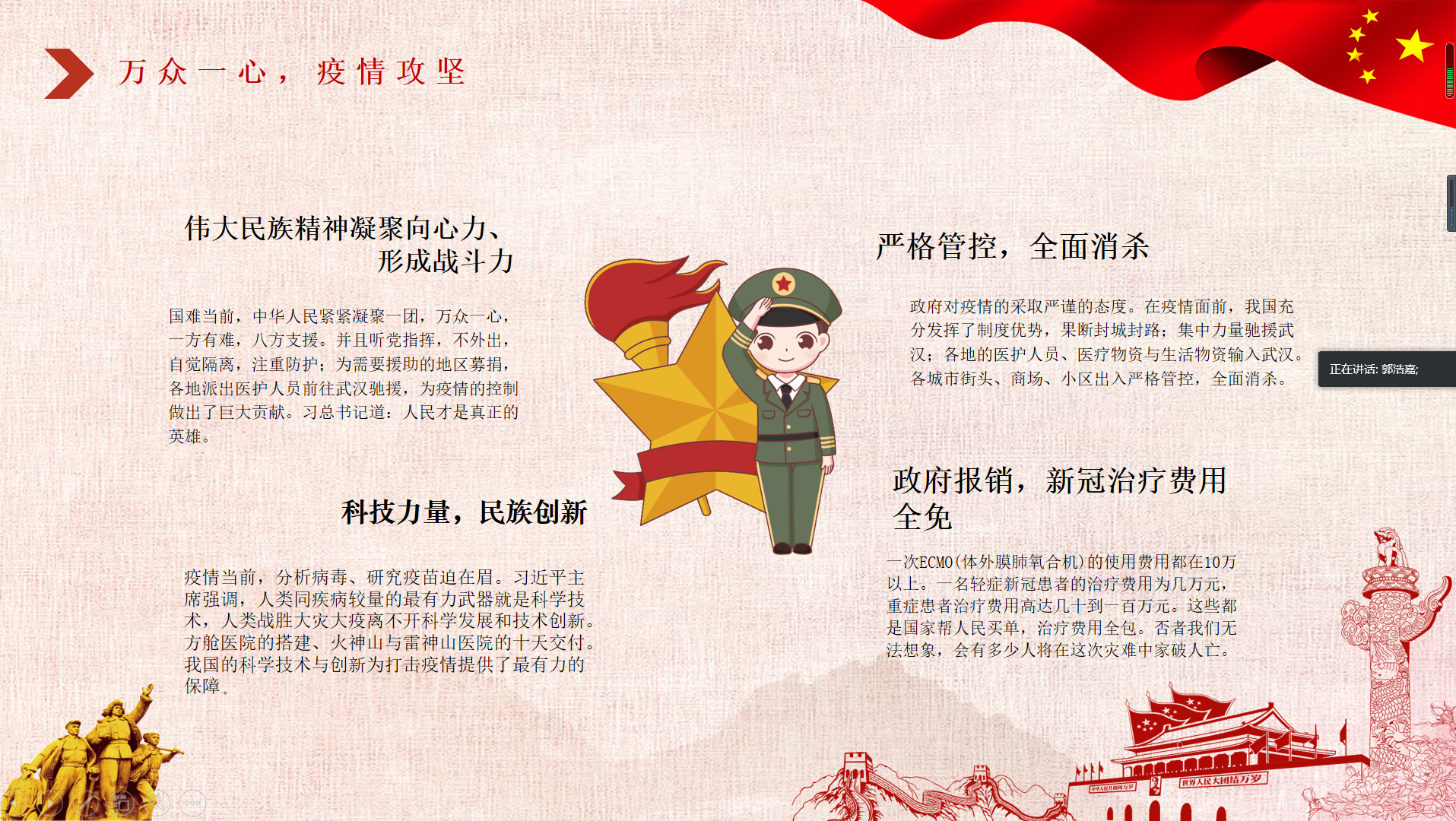 各党员在学习文件之后统一做出PPT以及文稿,向组织汇报学习感悟。大家积极踊跃发言,针对党的脱贫攻坚精神、主要任务、基本内容,面对疫情采取举措的意义和张桂梅精神等方面展开分享讨论。其中夏竭徽同志说道:“国难当前,中华人民紧紧凝聚一团,万众一心,一方有难,八方支援。并且听党指挥,不外出,自觉隔离,注重防护;为需要援助的地区募捐,各地派出医护人员前往武汉驰援,为疫情的控制做出了巨大贡献。