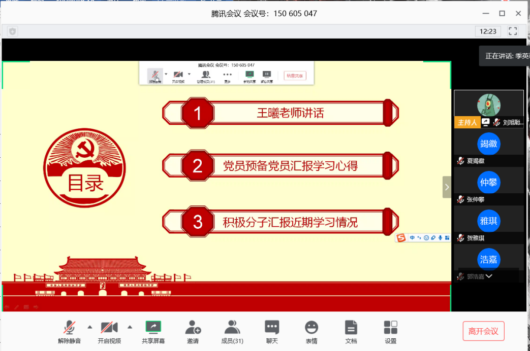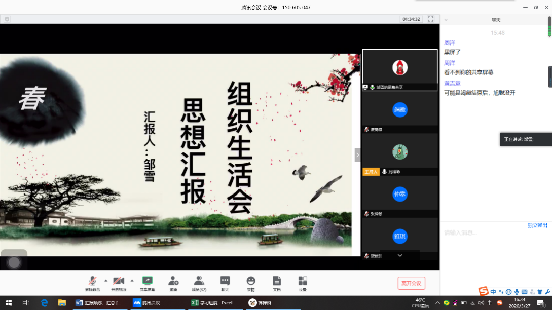2020年3月27日下午,yL23411永利集团材料系本科党支部开利用腾讯会议平台开展了3月份组织生活会,支部党员共35人,出席28人,另积极分子参会5人。
