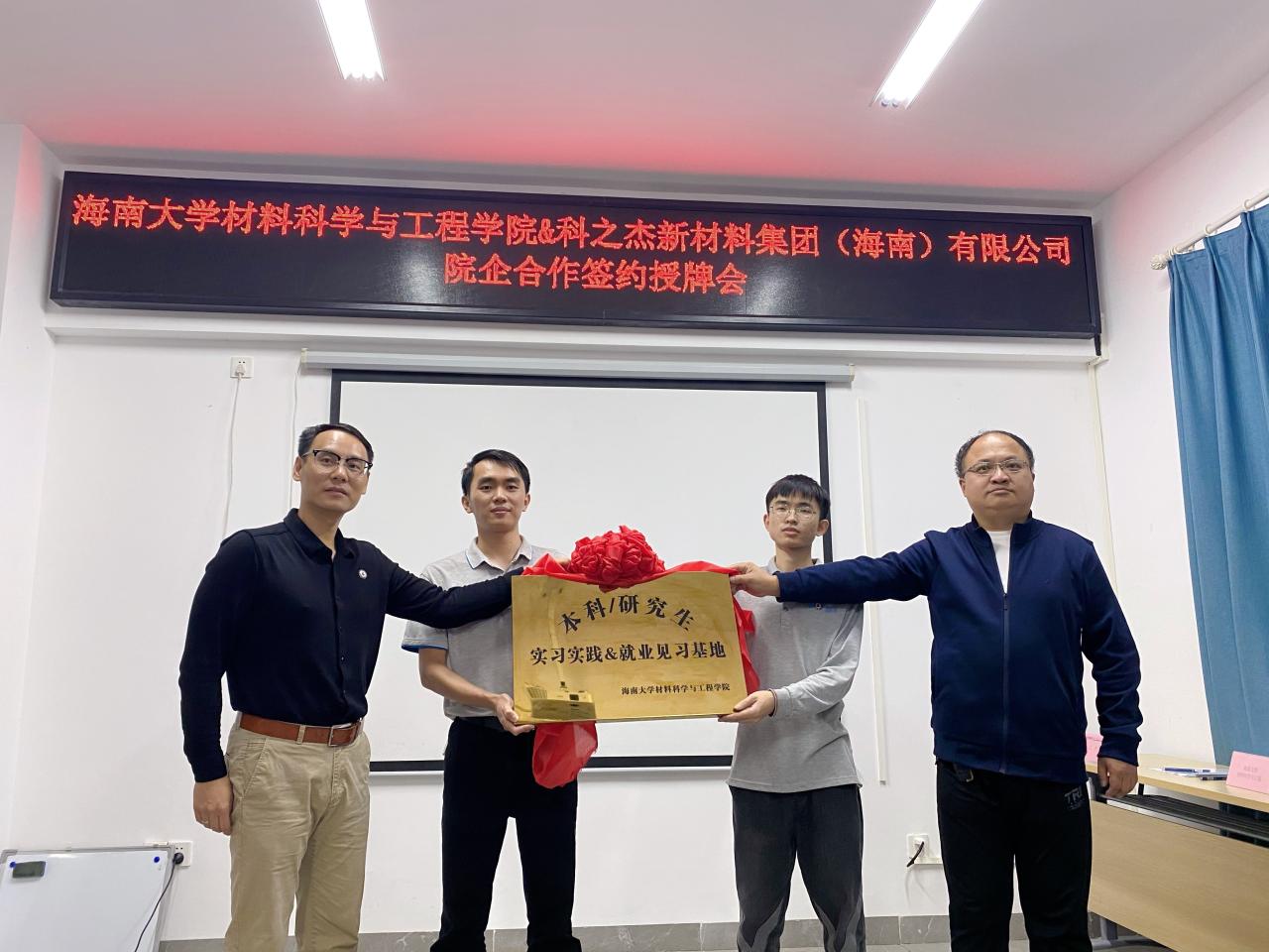 2021年12月15日下午,我院与海南科之杰新材料有限公司在海南澄迈举行了“本科生/研究生产实习见习基地” 共建活动及院企合作共建揭牌仪式。yL23411永利集团李长久副院长,党委副书记周郭军,材料系主任陈大明、教师代表曾琴丹、科之杰新材料有限公司总经理潘志峰,人事主管王妍、生产部厂长李英祥、技术室主任邱岳涛、营销部经理张彬及我院毕业就职院友代表等参加了本次活动。