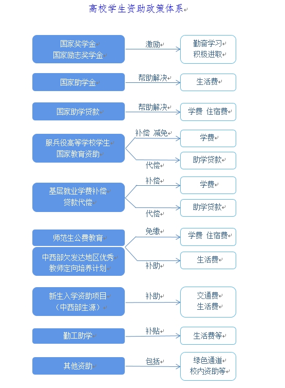 国家在高等教育本专科阶段建立起国家奖学金、国家励志奖学金、国家助学金、国家助学贷款等多种形式有机结合的高校学生资助政策体系。(如遇国家政策调整,以新政策文件为准执行)